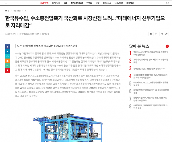 기사소개 (한국유수압, 수소충전압축기 국산화로 시장선점 노려...“미래에너지 선두기업으로 자리매김“)